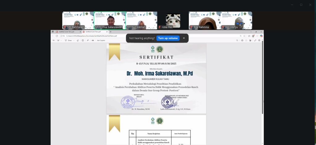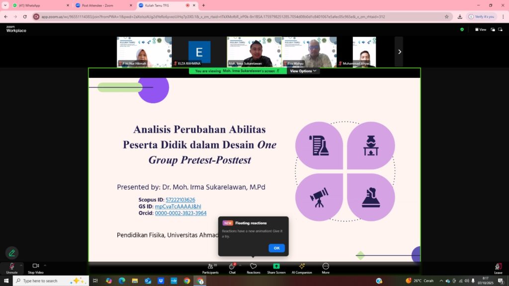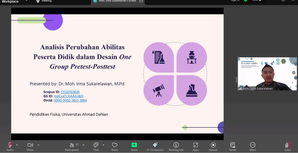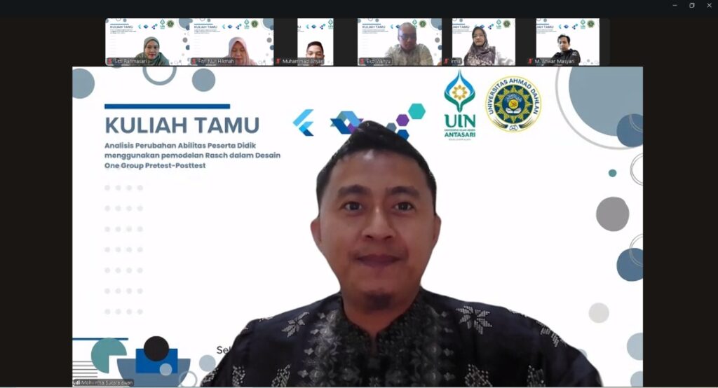 Pogram Studi Tadris Fisika Fakultas Tarbiyah dan Keguruan UIN Antasari mengadakan kuliah tamu bertema “Analisis Perubahan Abilitas Peserta Didik dalam Desain One Group Pretest-Posttest ajaran” pada hari Selasa, 07 Oktober 2025. Kegiatan ini berlangsung via Zoom dan dihadiri oleh dosen, mahasiswa, serta alumni Prodi Tadris Fisika UIN Antasari Banjarmasin.